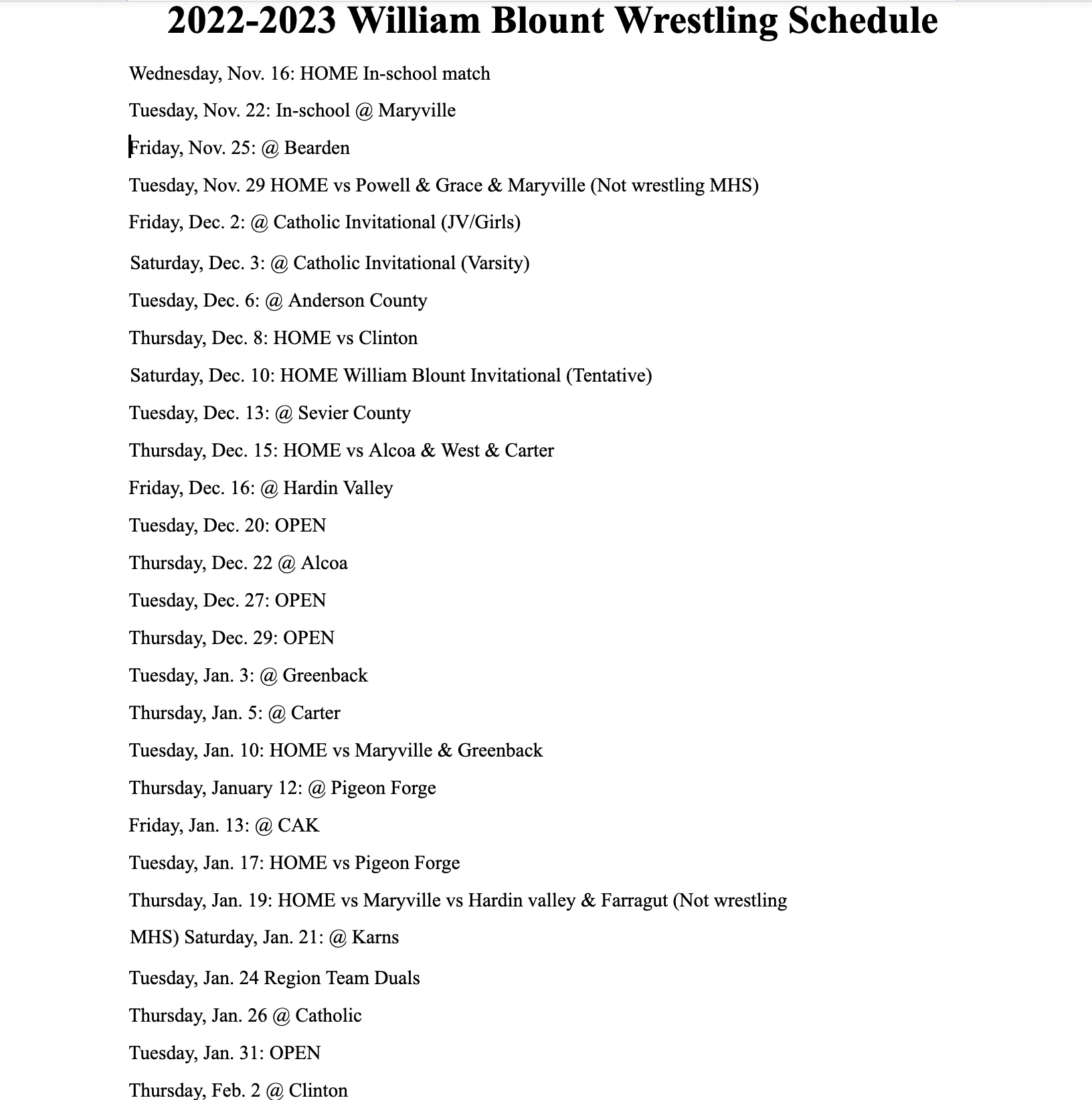 William Blount 2022-2023 Wrestling Schedules Share this: Click to share on X (Opens in new window) X Click to share on Facebook (Opens in new window) Facebook Like Loading... Leave a comment Cancel reply Δ This site uses Akismet to reduce spam. Learn how your comment data is processed.
