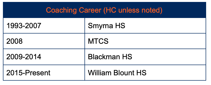 During his tenure at Blackman, he helped guide the Blaze to six playoff appearances. In 2013, the Blaze made a deep playoff run before losing to eventual-state-champion Maryville in the state semifinals. Coach Shadowens compiled a 59-17 (78%) record while at Blackman. Coach Shadowens has coached multiple successful Division I-FBS players as a Head Coach.